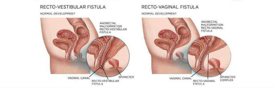 - એનાનોવાગ્નલ ફિસ્ટુલા અથવા રીક્ટોવૅજિનલ ફિસ્ટુલા ગુદામાર્ગ અને ગુદા અથવા યોનિ વચ્ચે થાય છે